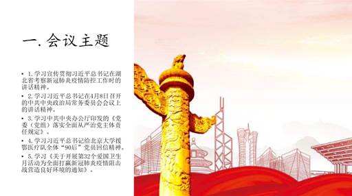 接着,支部负责人郭玉倩带领大家开展了系统的学习,学习了以下内容:学习宣传贯彻习近平总书记在湖北省考察新冠肺炎疫情防控工作时的讲话精神。学习习近平总书记在4月8日召开的中共中央政治局常务委员会会议上的讲话精神。学习中共中央办公厅印发的《党委(党组)落实全面从严治党主体责任规定》学习习近平总书记给北京大学援鄂医疗队全体“90后”党员回信精神。学习《关于开展第32个爱国卫生月活动为全面打赢新冠肺炎疫情阻击战营造良好环境的通知》精神。