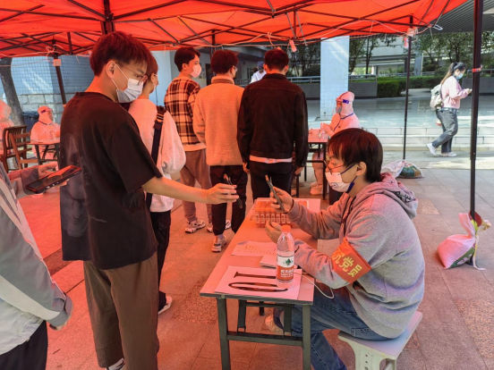 从11:00到13:30,面对源源不断到来的全校师生员工,下沉党员们始终一丝不苟地为师生扫码登记、严格核对身份信息,一刻也不停歇。面对来检测的同学,他们服务热情周到。对待手上的工作,他们严谨细致。他们用辛劳与汗水,以党员的责任担当筑牢校园疫情防控安全防线。