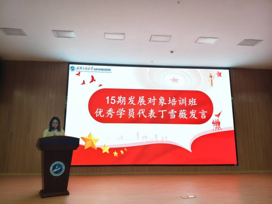 第15期发展对象培训班优秀学员丁雪薇代表发言,分享了成为中共预备党员以来学习实践党的相关理论知识的心得感悟,希望广大学员都能够积极从思想上争取入党,早日加入党组织,努力成为一名新时期的合格共产党员。