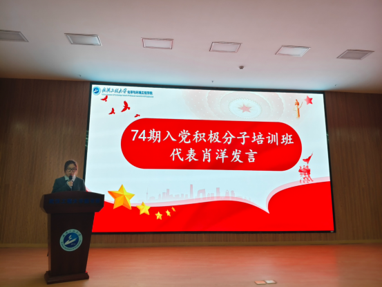 第74期入党积极分子培训班学员肖洋代表全体学员郑重承诺,会珍惜这次党校培训的机会,认真学习,在工作学习和社会生活中起先锋模范作用,用实际行动和优异成绩接受党的考察和检验,争取早日加入中国共产党,为实现共产主义奋斗终身。