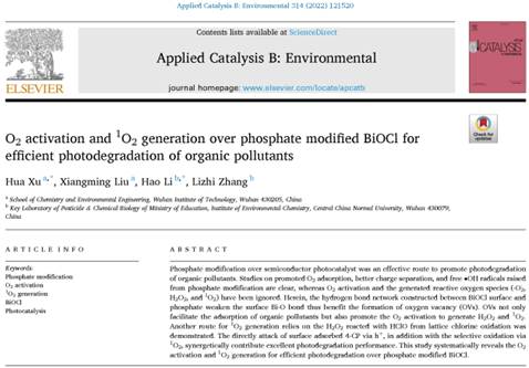 (通讯员程然)近期,环境科学领域国际权威期刊AppliedCatalysis B : Environmental (IF=19.503)在线发表了永利yl23411集团许华老师的研究论文“O2activation and1O2generation over phosphate modifiedBiOCl for efficient photodegradation of organic pollutants (Applied Catalysis B: Environmental 314(2022)121520)”(第一来源:永利yl23411集团许华,第二来源:永利yl23411集团硕士刘香铭)。