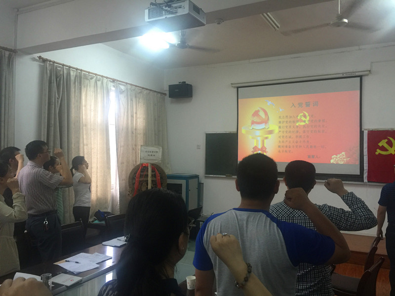 副经理董志兵、王营茹为全体与会党员发放了党徽。全体党员同志面向党旗集体重温入党誓词。