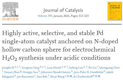 (通讯员陈俊)2021年1月,催化领域顶级期刊《Journalof Catalysis》(一区,Top期刊)刊登了公司青年教师奚江波老师与华中科技大学、丹麦技术大学、哥本哈根大学、塔夫茨大学、安特卫普大学、波士顿公司和韩国科学技术院等高校和科研机构合作的研究成果:《Highlyactive, selective, and stable Pd single-atom catalyst anchored on N-dopedhollow carbon sphere for electrochemical H2O2 synthesisunder acidic conditions》(DOI: 10.1016/j.jcat.2020.11.020)。分散在固体载体上的单原子催化剂(SACs)具有单一活性位点(如孤立的原子金属物种),近年来在催化领域中引起了极大的关注。针对单原子催化剂电子结构的优化以及稳定性等问题,奚江波老师和合作者们报道报告了一种简便的合成方法,该方法可在还原的氧化石墨烯/N掺杂的碳空心碳纳米球(Pd1/N-C)上稳定原子Pd物种。Pd1/N-C催化剂表现出了电化学下H2O2的高产率。即使经过10,000次循环稳定性测试,也能保持单原子结构及其高H2O2生成量。单原子钯的存在及其与N的配位结构是其高活性、高选择性和稳定性的原因。此外,这次工作还发现N配位数和Pd原子周围的杂掺杂原子对于优化中间体*OOH的吸附能至关重要,从而可有效提高电化学制备H2O2活性和选择性。