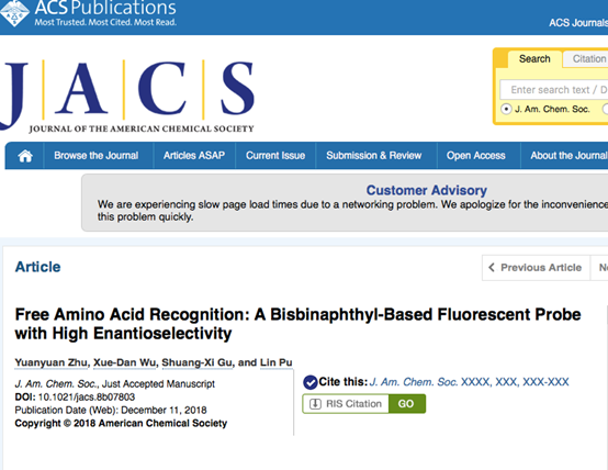 12月14日,永利yl23411集团朱园园老师作为第一作者,永利yl23411集团作为第一单位,在《美国化学会志》JACS上发表文章《Free Amino AcidRecognition: A Bisbinaphthyl-Based Fluorescent Probe with High Enantioselectivity》,JACS杂志是美国化学学会的旗舰期刊,为中科院化学大类一区和JCR一区期刊,当前影响因子为14.357。论文链接: