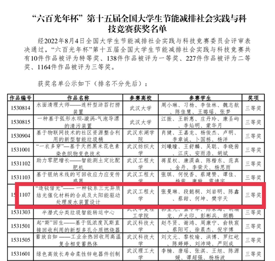 (通讯员 贾丰成)近日,第十五届全国老员工节能减排社会实践与科技竞赛在天津大学落下帷幕。由化环公司推送的参赛作品《“造铋借光”——一种铋系三元异质结光催化材料的合成及太阳能驱动处理废水装置设计》,在柯军、张哲两位老师的共同指导下,由2018级环境工程专业张曼琳负责,在刘岩明,段懿桐,陈鑫,蔡甜,何坤,樊宇天等同学的共同努力下,荣获国家三等奖。