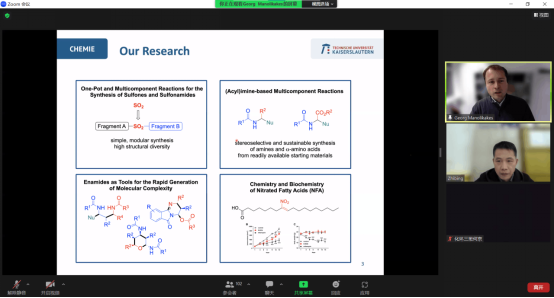 11月28日,Georg Manolikakes教授以《Nitro Fatty Acids, an Intriguing Class of Endogenous Signaling Mediators》为题,详细讲述了以常见结构单元的烷基溴化物为起始物,通过模块化的合成策略高效合成硝基脂肪酸(NFA)的方法。Georg Manolikakes教授通过多组分一锅法合成策略简化了NFA的合成,还对不同NFA靶标的特定结构、活性关系和选择性进行了详细分析与介绍,为进一步研究改善硝基脂肪酸类化合物的药代动力学和治疗效果提供了重要参考。
