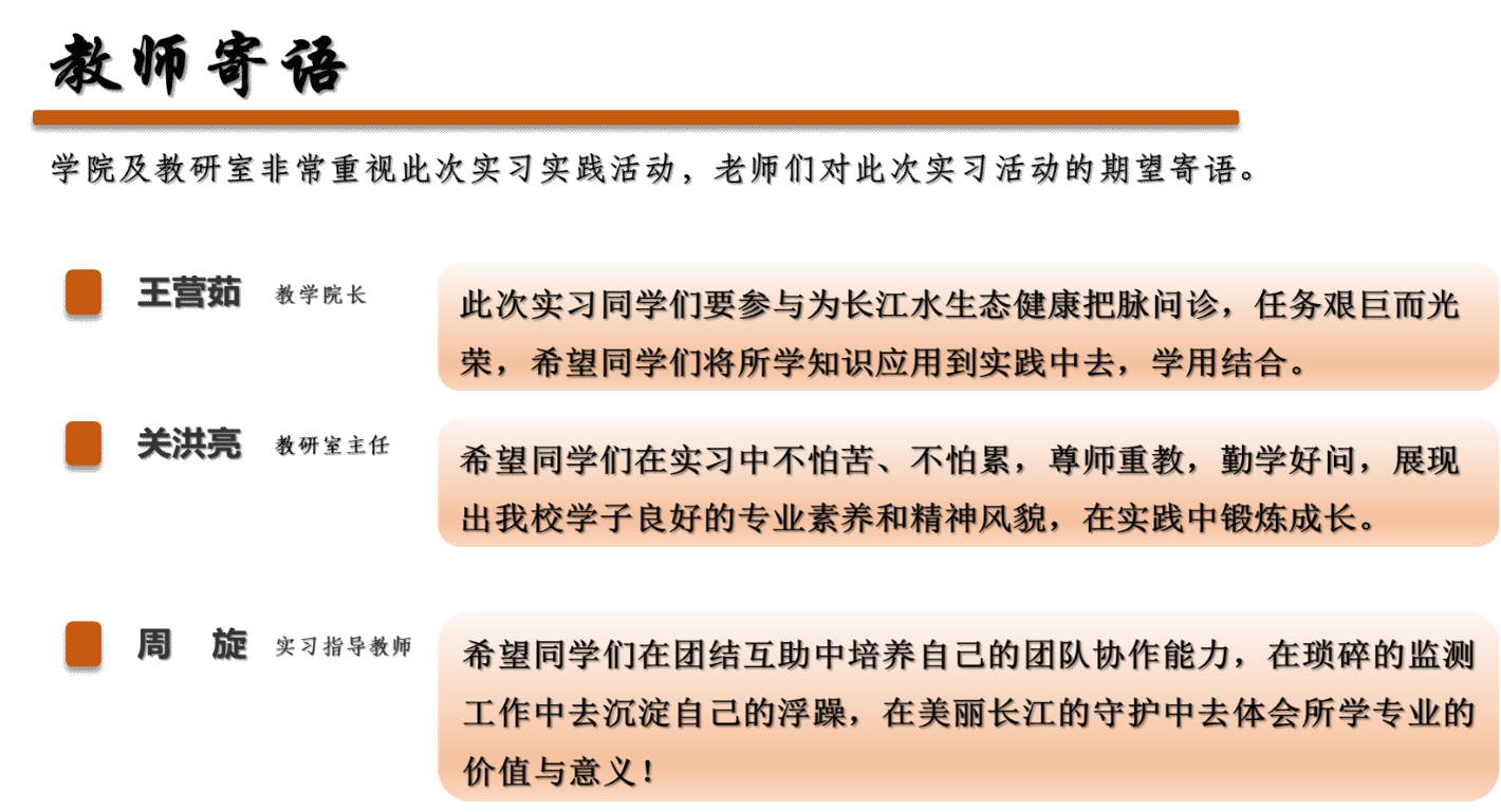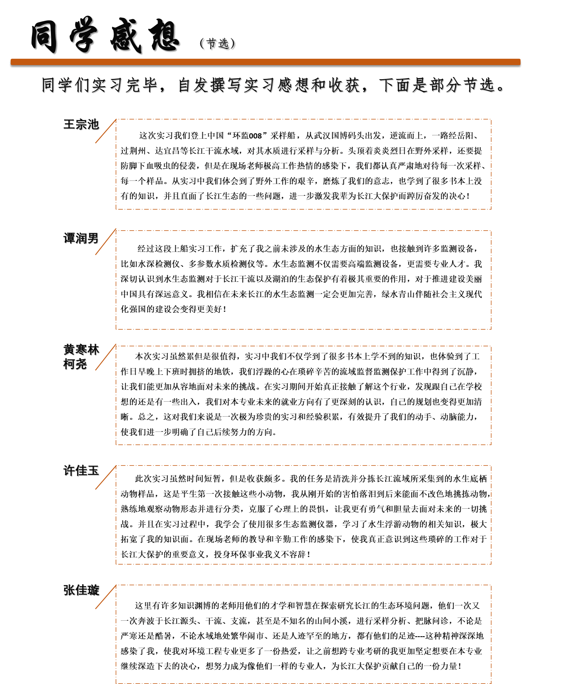 实习期间,同学们早出晚归坐地铁往返于公司,每次约3小时,上船外出采样吃住都在船上,尽管如此辛苦,同学们觉得能利用所学专业知识亲身参与到长江大保护的各个岗位,感到异常兴奋。在为期一个月的实习结束后,同学们非常不舍,纷纷表示此次实习收获良多、受益匪浅,不仅扩充了水生态方面的知识,开阔了眼界,让自己浮躁的心在琐碎繁杂的流域监督监测工作中得到了沉淀,在逆流而上的采样船上见证了长江浪涛拍岸的气势和水天相接的娴静,对习近平新时代中国特色社会主义思想,特别是习近平生态文明思想有了更深刻认识,也真正体会到了美丽中国建设的责任与义务、自豪与光荣!