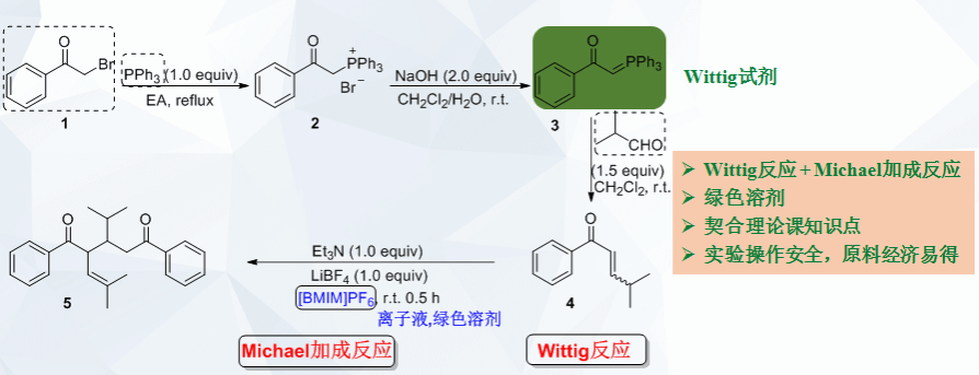 项目简介:有机人名反应是有机化学反应的基石,是应用化学专业本科生必须掌握的有机化学知识点。本项目基于本科生有机化学理论知识基础,设计了一个融合Wittig反应和Michael加成反应两个人名反应的综合有机化学实验,该实验从α-溴代苯乙酮和三苯基膦等廉价易得的原料出发,合成并纯化得到2-异丁烯基-3-异丙基-1,5-二苯基-1,5-戊二酮产物。实验设计内容与本科阶段有机化学理论知识高度契合,涉及多步有机合成,涵盖多种基本实验操作,可锻炼员工的实验设计能力和实验操作能力,并且,实验还引入绿色溶剂离子液体作为反应溶剂来培植员工的绿色化学理念。
