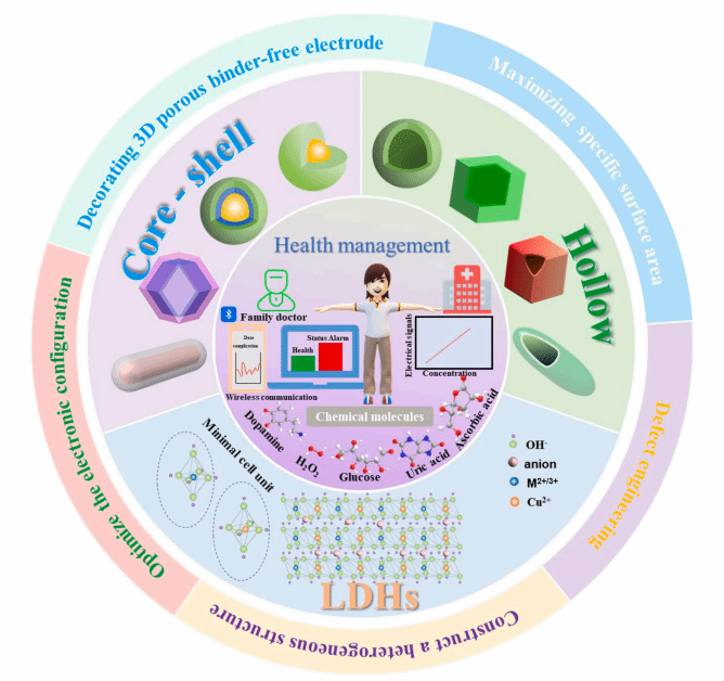 在这篇综述中,作者详细讨论了利用Kirkendall效应、电化学置换反应和Ostwald熟化效应制备空心结构材料的方法。接着,作者进一步探讨了利用离子交换、共蚀沉淀、硫化、自模板、一锅法、电化学置换反应和配体保护方法设计复杂的空心和核壳结构。此外,作者还回顾了铜基层状双氢氧化物的最新研究,并提出了三种合成策略:水热法、一步共沉淀法和电沉积法。为了提高铜基材料的电化学传感性能,作者提出了五种先进的优化策略,包括增加比表面积,构建异质结构,优化电子结构,修饰3D多孔无粘结剂电极和缺陷工程设计。作者还重点介绍了铜基材料在人体健康管理中的先进应用,例如人体血液/体液中葡萄糖、H2O2、尿酸和多巴胺的检测等,有助于糖尿病监测、氧化应激检测、尿酸痛风监测和帕金森病诊断。最后,作者提出了铜基材料的制备以及在生物传感器应用中面临的挑战,并展望了未来的发展前景。作者认为,未来的研究应该集中在提高材料的稳定性、优化传感器的灵敏度和选择性以及开发多功能应用的传感器。