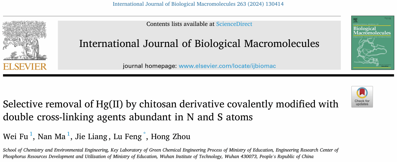 本网讯(通讯员冯露)近日,永利yl23411集团环境工程专业2021级本科生付玮以第一作者在国际知名期刊《International Journal of Biological Macromolecules》(中科院一区Top期刊,影响因子8.2)发表了题为《Selective removal of Hg(II) by chitosan derivative covalently modified with double cross-linking agents abundant in N and S atoms》的学术论文。化环公司青年教师冯露博士为论文独立通讯作者,永利yl23411集团官网为第一署名及通讯单位。