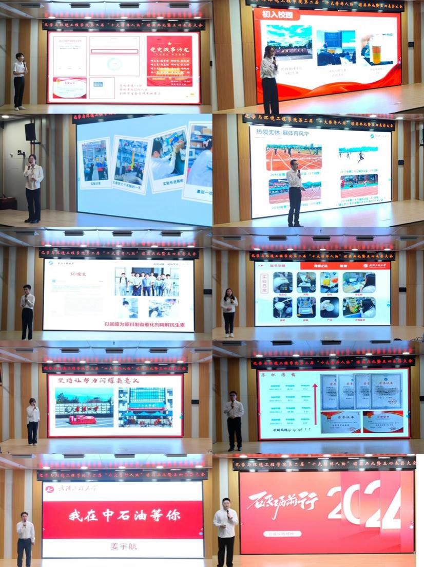 学风创优榜样杜静、公益实践榜样杨田雨、学风创优榜样张赫、高端就业榜样姜宇航、学风创优榜样孟高德、学风创优榜样吴雨溪、体育竞技榜样刘钦、科技创新榜样付玮、员工干部榜样赵吉祥、学风创优榜样李文婕共十位优秀化环学子发言,他们在学风创优、公益实践、高端就业、体育竞技等领域做出了突出贡献,展现出坚定的信念和执着的追求,为大家树立了榜样。