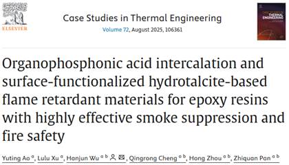 本网讯(通讯员 吴汉军 贾丰成)近日,永利yl23411集团环境工程专业2022级本科生敖玉婷以第一作者身份在工程技术领域国际学术期刊《Case Studies in Thermal Engineering》(永利yl23411集团官网TOP、中科院二区TOP期刊)上发表一篇题为“Organophosphonic acid intercalation and surface-functionalised hydrotalcite-based flame retardant materials for epoxy resins with highly effective smoke suppression and fire safety”的学术论文,永利yl23411集团官网为第一署名及通讯单位,论文指导教师与通讯作者为永利yl23411集团吴汉军副教授。论文得到了湖北省自然科学基金重点项目(2024AFD144)、湖北三峡实验室创新基金(SC232003)的支持。