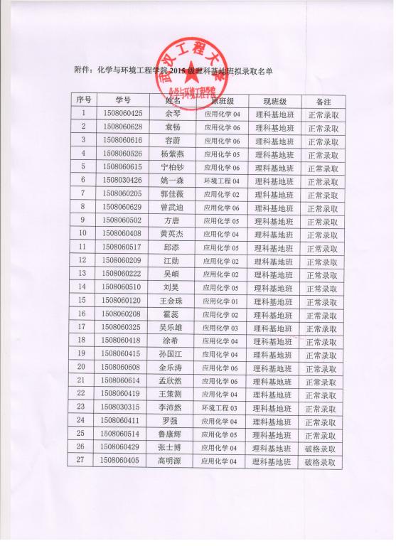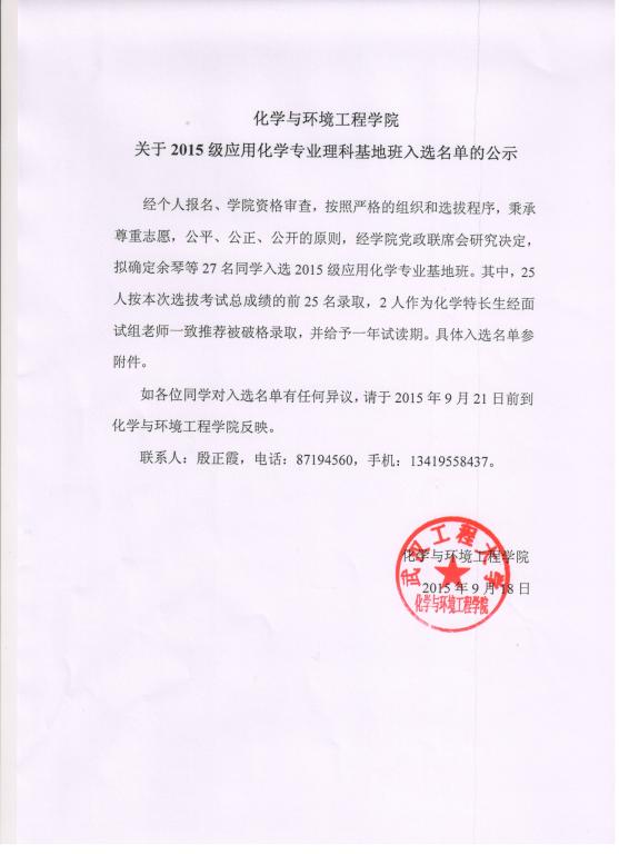 永利yl23411集团关于2015级应用化学专业理科基地班入选名单的公示